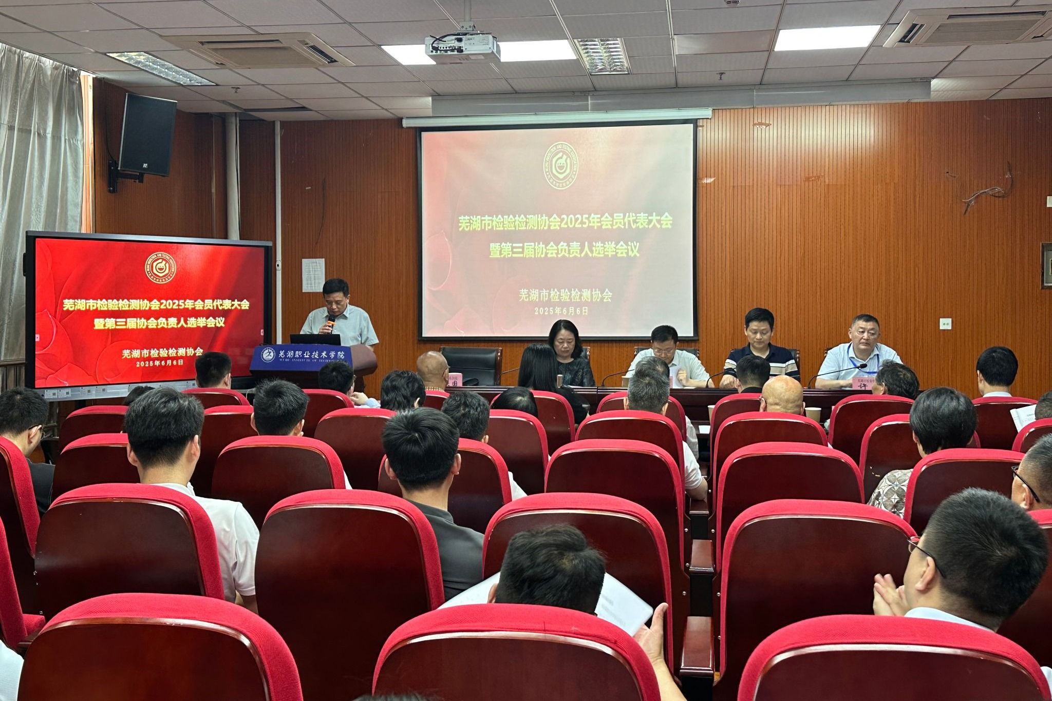 6月6日,芜湖市检验检测协会2025年会员代表大会暨第三届协会负责人选举会议在我校食品与生物工程学院报告厅召开。市科协副主席徐继成、市市场监管局副局长程锐、市民政局陈莉昌主任、校科研处处长吴庆国、食品与生物工程学院班子成员等出席会议,与50余家会员单位代表齐聚一堂,共同见证协会十年发展成果,选举新一届协会负责人,共谋行业高质量发展路径。