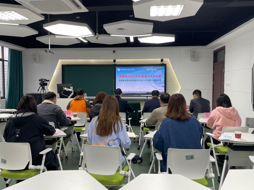 为促进学校中外合作办学项目高质量发展,切实提升国际化办学水平,3月21日,芜湖职业技术学院与韩国顺天乡大学在我校食品与生物工程学院五楼智慧教室召开食品检验检测技术项目管理与教学线上研讨会,我校国际教育管理学院、教务处、科研处相关领导、老师以及食品与生物工程学院领导班子成员等参会,韩国顺天乡大学国际交流处处长柳炳旭、副处长林栽参以及教师代表远程出席会议,会议由副院长张冬冬主持。