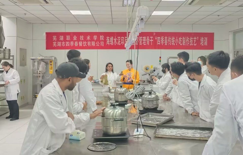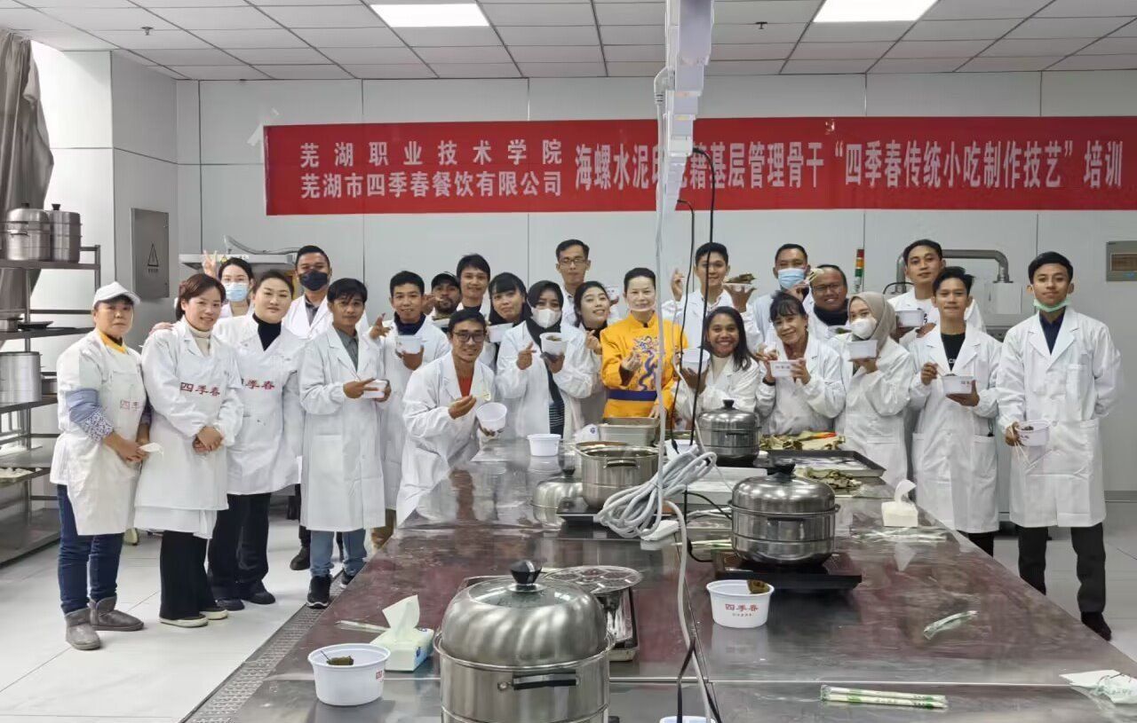 12月14日,我校与芜湖四季春餐饮有限公司在“非遗技艺传承”研习基地联合举办海螺水泥印尼区域首批印尼籍基层管理骨干——“四季春传统小吃制作技艺”专项培训。