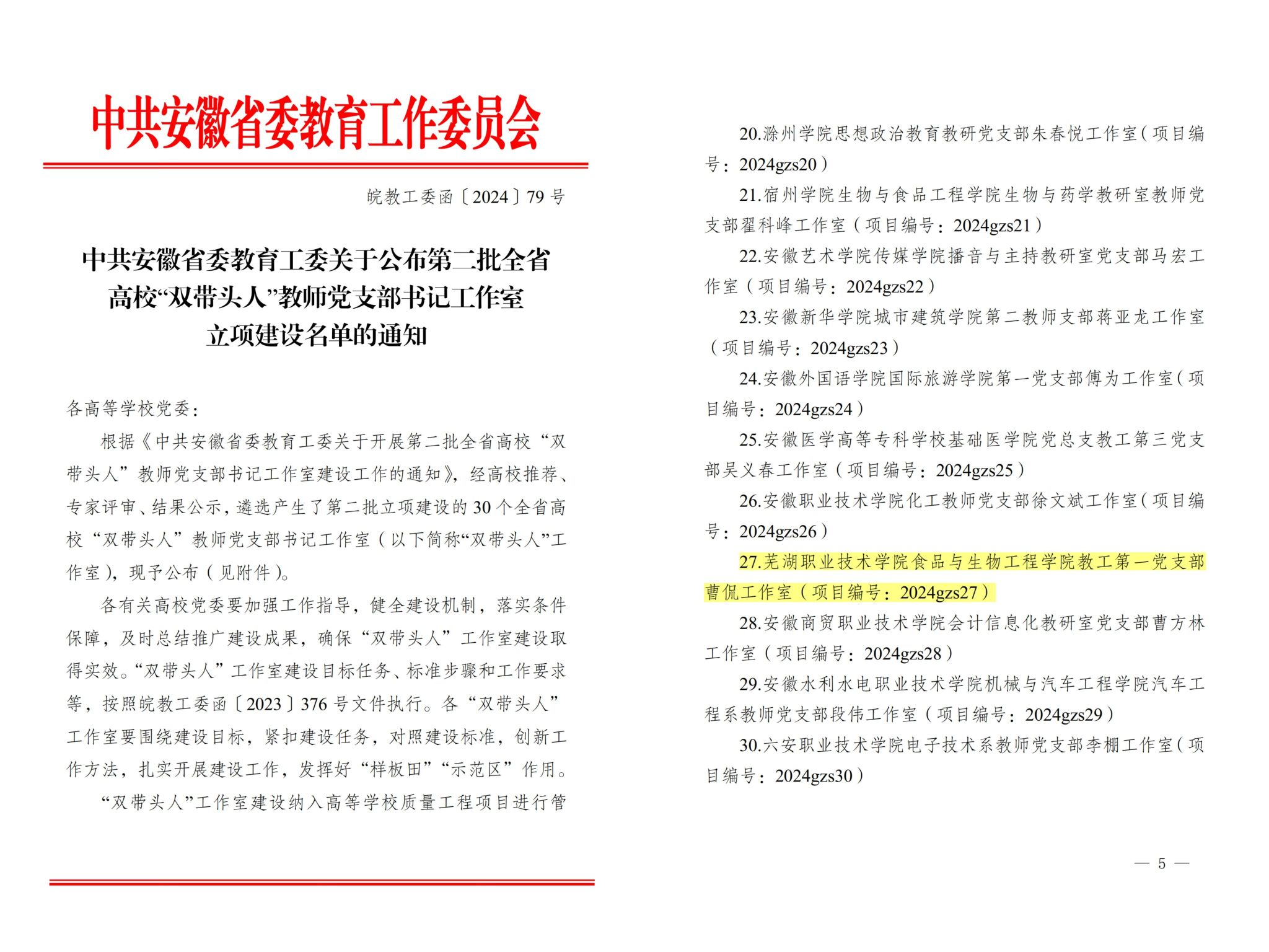 近日,安徽省委教育工委公布了第二批全省高校“双带头人”教师党支部书记工作室立项建设名单,芜湖职业技术学院食品与生物工程学院教工第一党支部曹侃工作室成功入选。