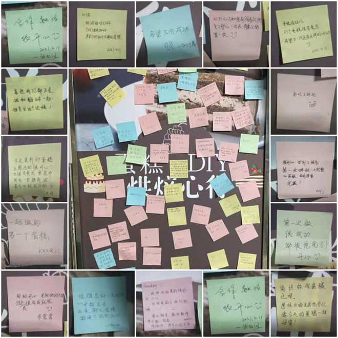 蛋糕制作完成后,我们收集了同学们的心得感受,他们在便利贴上流露了当下的心情。有同学说,“很开心,很幸福,希望学校多多举办此类活动!”;还有同学说,“虽然我们还不太会做,但和姐妹们在一起,很享受这个过程!”;还有同学说,“会有始料不及的运气,也会有突如其来的惊喜,比如遇见你!”…….