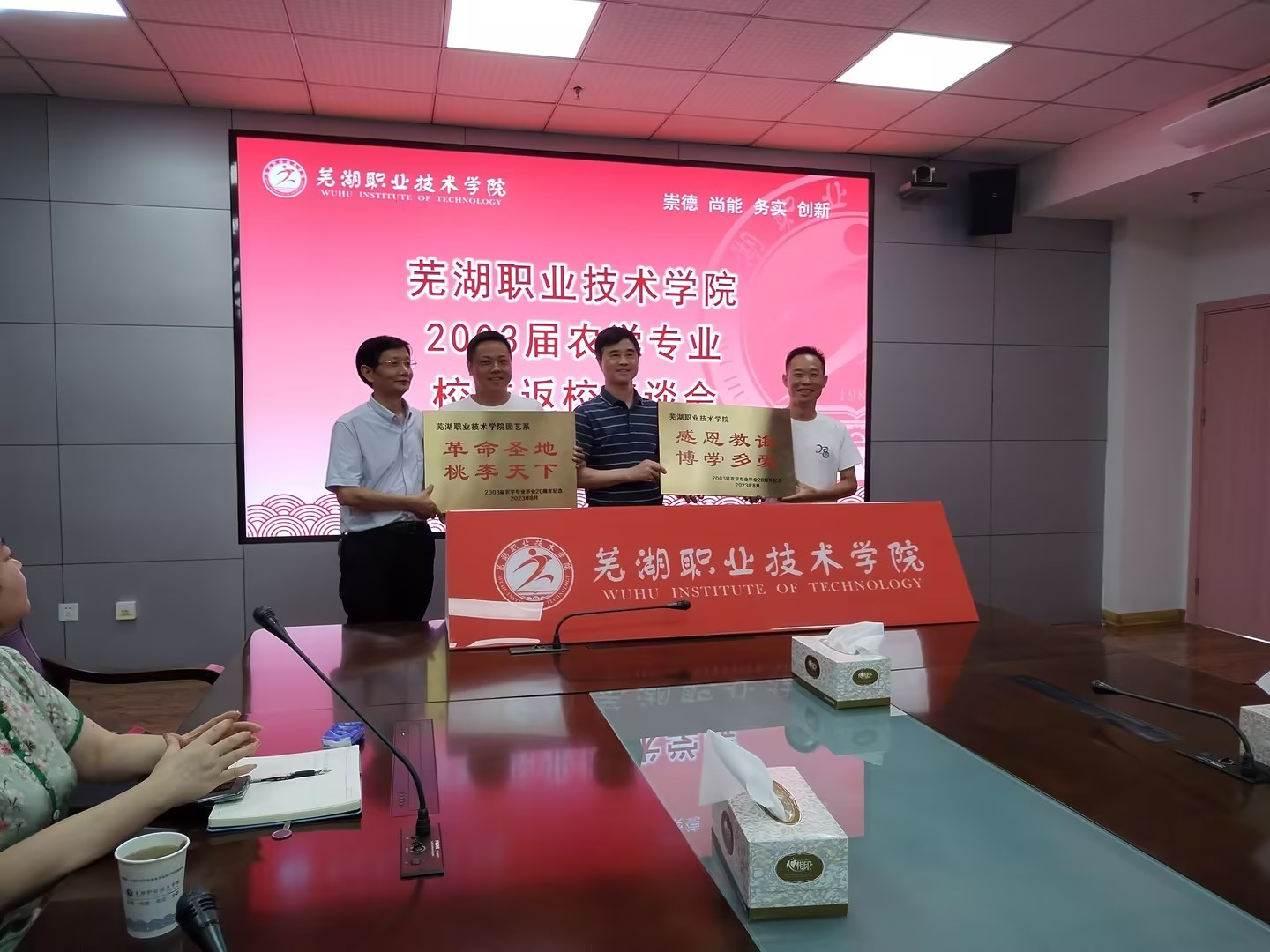 8月5日,芜湖职业技术学院原东校区2003届首届农学专业的校友们在这个充满阳光与热情的盛夏齐聚母校,学校在文津校区正德楼1112会议室召开毕业二十周年师生座谈会,党委委员、副院长季慕寅,食品与生物工程学院党总支书记彭常安,园林园艺学院院长桂美根以及部分老教师代表参加了座谈会,会议由机关党委书记、校友办主任钟瑞主持。