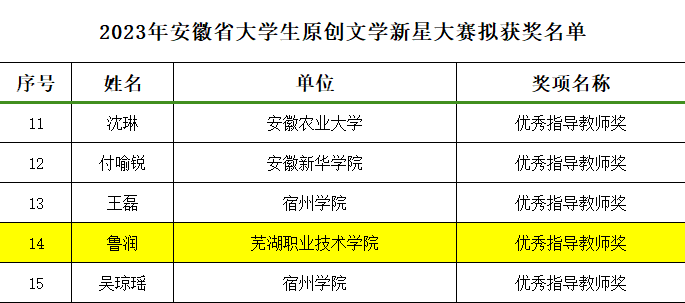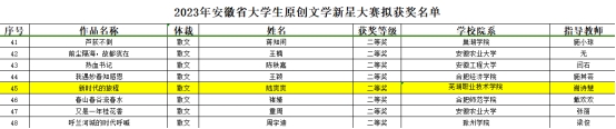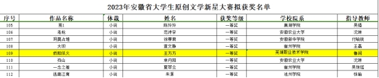 近日,由安徽省教育厅主办,安徽大学承办的2023年安徽省大学生原创文学新星大赛评审结果公示,经组委会专家评审,食品与生物工程学院王方方《娇阳似火》获小说组一等奖,陆爽爽《新时代的旅程》获散文组二等奖。鲁润老师获优秀指导教师奖。
