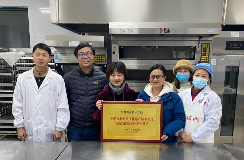 非遗文化传承赓续,百年技艺振兴创新。我校耿福兴传统小吃制作技艺非遗传承基地是2022年市文化和旅游局首批认定的“芜湖市非物质文化遗产传承基地”。非遗传承是我校双高建设的一项内容,为更好担负起非遗传承基地的使命,校食品与生物工程学院骨干教师与耿福兴技艺大师创新了以推动非遗活动传承为主线的职教新模式,把非遗小吃加工技艺传承、课程思政和创业创新教育有机结合,大力推动百年老字号--芜湖耿福兴非遗小吃技艺传承实践体验进校园活动,助力食品检验检测技术“双高”专业群建设。