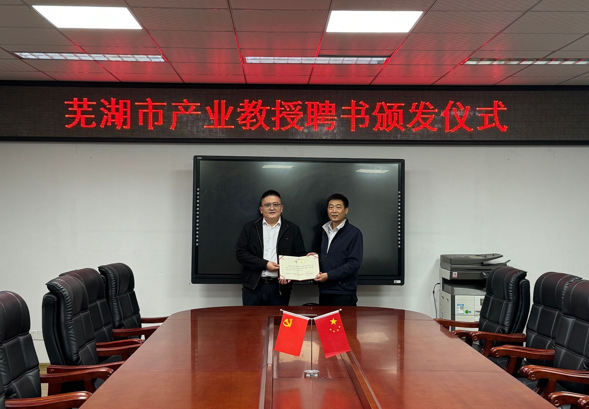 讲座结束后,学院举行了芜湖市产业教授聘用证书颁发仪式,院长张强为聘请吴开明颁发证书,双方围绕人才培养、科技创新和成果转化等方面的深远合作达成了共识。