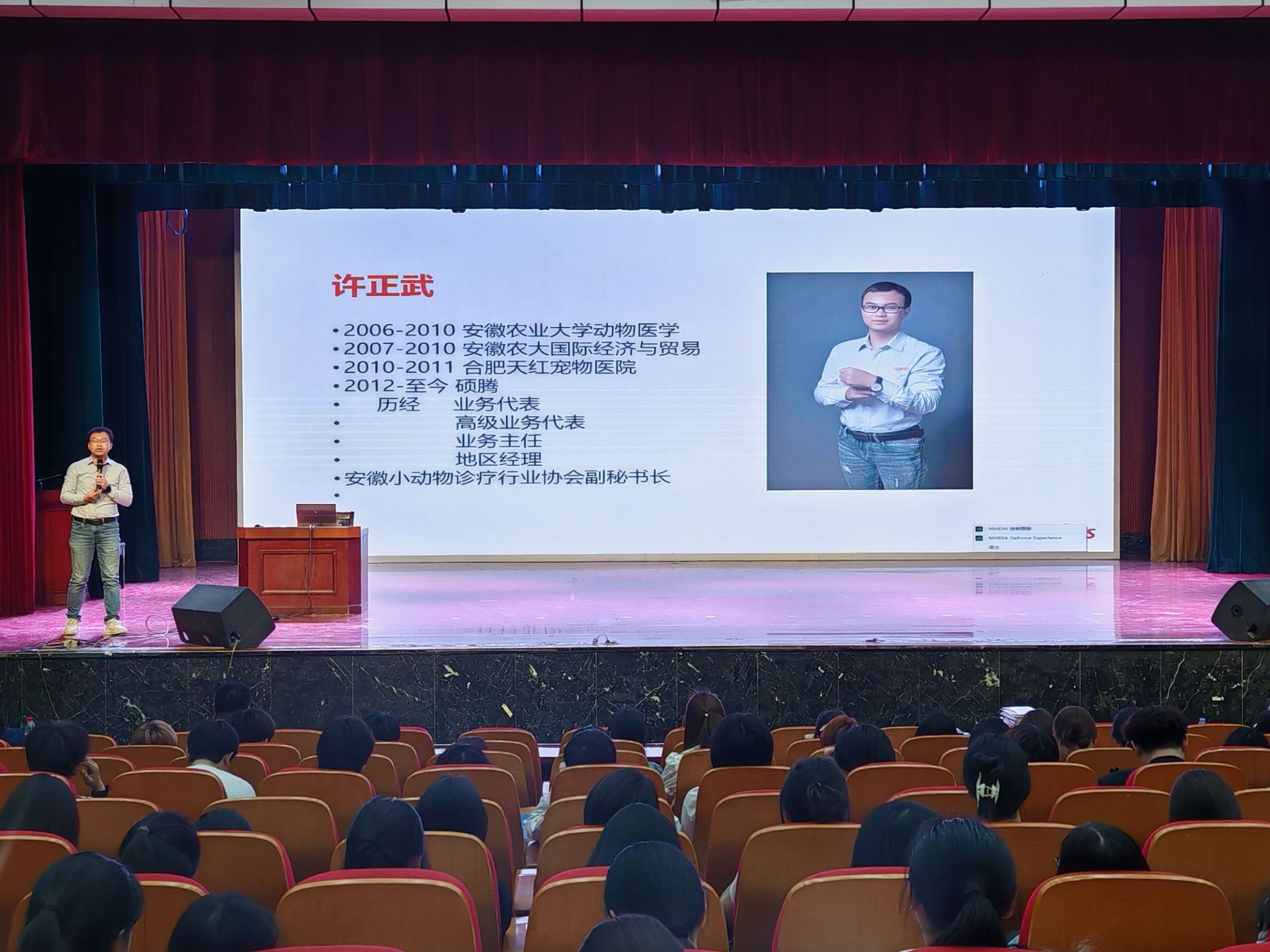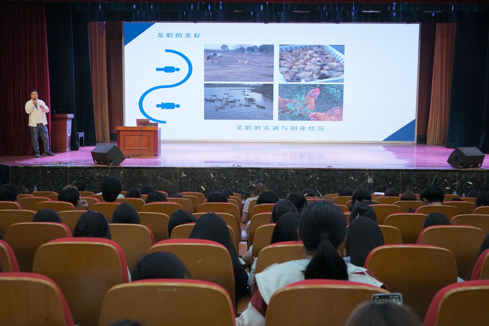 2025 年 4 月 10 日下午,食品与生物工程学院成功举办了主题为“用爱心创业 用专业盈利”的大学生职业生涯规划创业宣讲活动。此次活动特别邀请了四位行业精英,他们分别是硕腾(上海)企业管理有限公司华东三区地区经理许正武、合肥宠欣安连锁宠物医院总院长张晓峰、合肥宠欣安眼科专科医院院长刘盼以及六安宠福鑫连锁宠物医院院长吴用。其中,刘盼和吴用分别是我院 2014 届和 2015 届的优秀校友,他们的回归为此次活动增添了更多亲切感和榜样力量。