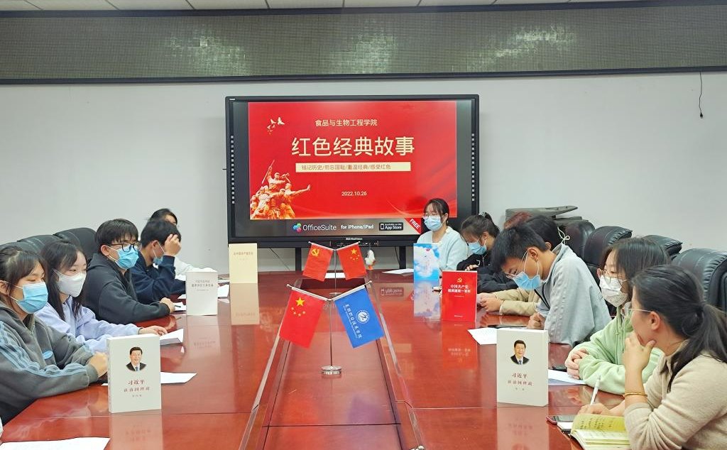 为庆祝党的二十大胜利召开, 10月26日,食品与生物工程学院在院会议室开展了“庆祝二十大,书香励初心”读书分享会。食品与生物工程学院全体学生党员和入党积极分子参加,活动邀请了院学生党支部书记谢诗慧、辅导员鲁润老师参与点评,在场师生共同重温经典,感受红色文化。