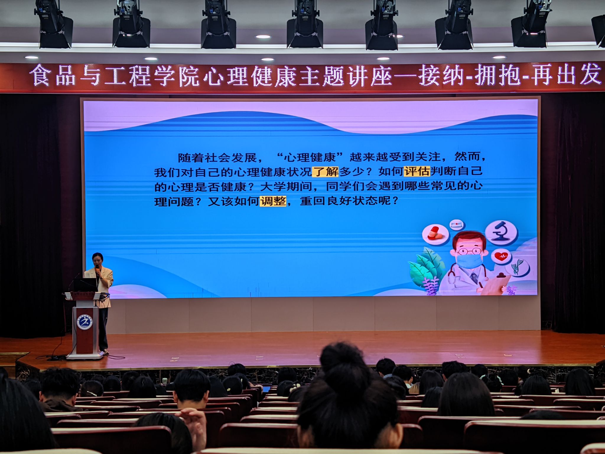 4月24日,食品与生物工程学院邀请大学生健康成长指导中心周静雯老师来我院开展心理健康教育专题讲座。本次讲座面向我院大一大二全体同学,旨在帮助同学们认识心理健康的重要性,学习有效的评估技能和调适方法,以更好地应对大学生活中的压力和挑战。讲座由学院党总支副书记陶玲凤主持。