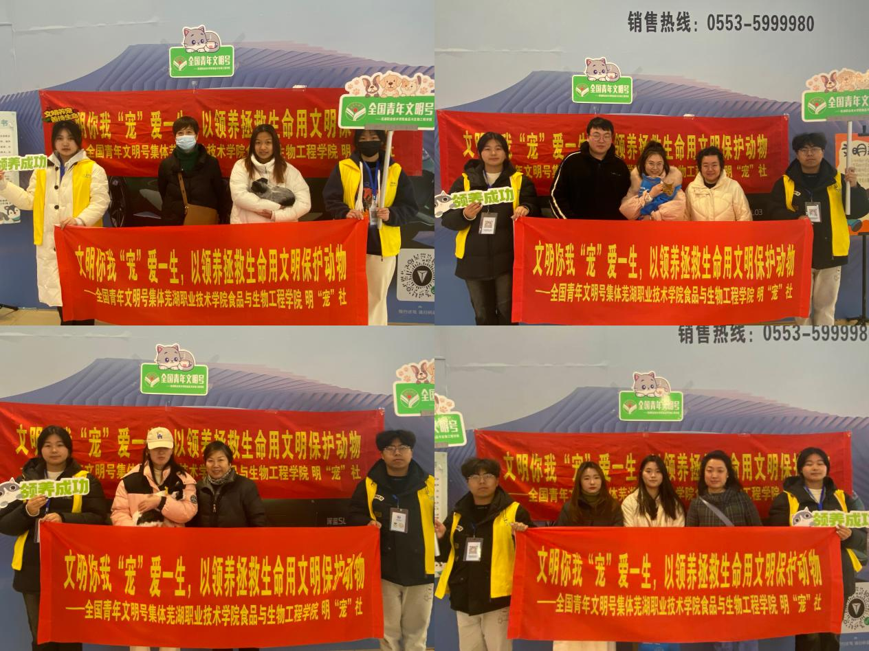 为弘扬奉献、友爱、互助、进步的志愿精神,展现我院学子积极向上的精神风貌,发挥全国青年文明号的示范引领作用,12月17日,全国青年文明号芜湖职业技术学院食品与生物工程学院师生带领大学生社团明“宠”社志愿者在芜湖市吾悦广场开展第四十四期“文明你我,‘宠’爱一生”大型公益实践活动。