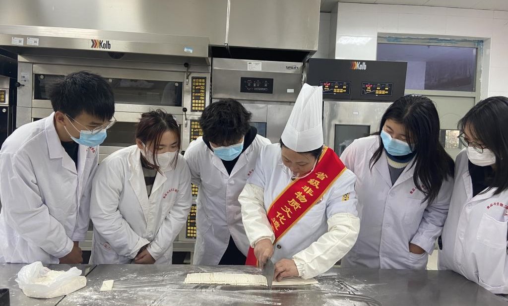 非遗文化传承赓续,百年技艺振兴创新。我校耿福兴传统小吃制作技艺非遗传承基地是2022年市文化和旅游局首批认定的“芜湖市非物质文化遗产传承基地”。非遗传承是我校双高建设的一项内容,为更好担负起非遗传承基地的使命,校食品与生物工程学院骨干教师与耿福兴技艺大师创新了以推动非遗活动传承为主线的职教新模式,把非遗小吃加工技艺传承、课程思政和创业创新教育有机结合,大力推动百年老字号--芜湖耿福兴非遗小吃技艺传承实践体验进校园活动,助力食品检验检测技术“双高”专业群建设。