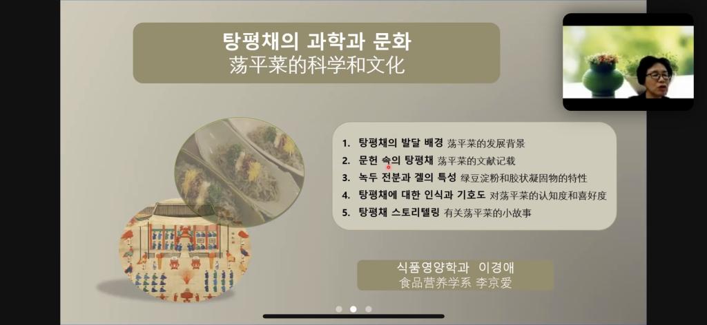 讲座中,文世勳教授以《提升食品性能乳化体系的开发》为题,系统阐述了乳化剂在食品中扮演的重要角色,并进一步探讨了乳状液类型和提升食品性能乳化体系的开发方法和作用机制。李京爱教授围绕《荡平菜的科学与文化》主题,对荡平菜的发展背景、文献记载,绿豆淀粉和胶状凝固物的特性作了讲解。讲座内涵丰富,既有深入的理论分析,又有对韩国文化的特色阐释,让参会教师对食品行业前沿知识和相关国际文化背景有了更深刻的认知与了解。