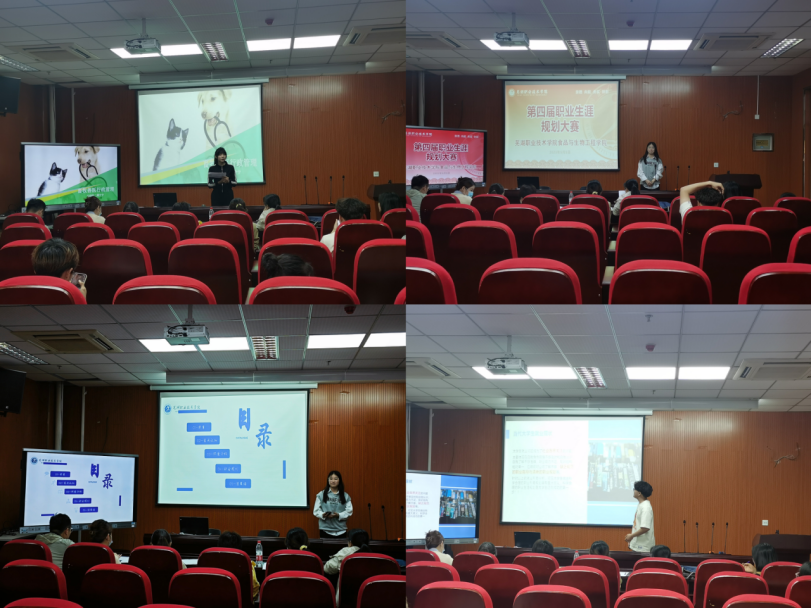 进入选拔赛的选手有22宠医杨锐峰、22食检蒋成燕、22动检黄宁宁三位同学。参赛选手结合自己的职业规划设计书,按抽签顺序依次进行演讲。通过PPT演讲,理性分析自己的职业兴趣、性格、职业价值观、能力等,综合分析社会环境、家庭环境等各方面的因素,对未来的职业生涯进行详细且合理的规划。