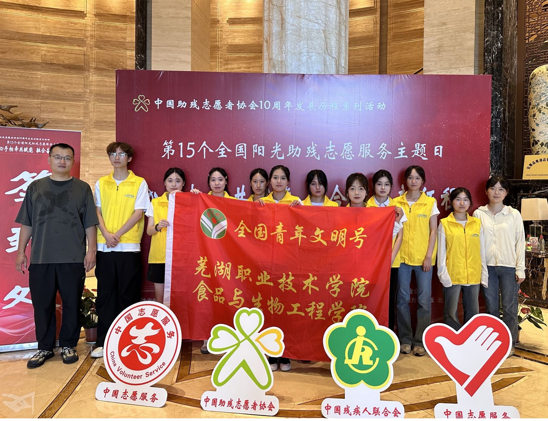 7月6日,中国助残志愿者协会10周年发展历程系列活动暨“心手相牵共赋能 融合奋进新征程”第十五个全国阳光助残志愿服务主题日活动在芜湖市举行,活动由中国助残志愿者协会、芜湖市人民政府主办。活动现场,芜湖职业技术大学食品与生物工程学院被正式授予全国“阳光助残志愿服务基地”称号。食品与生物工程学院党总支书记彭常安、全国青年文明号号长刘宽辉受邀参加活动。
