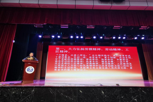 随后金根木主席发表了致辞,金主席说:劳模是国家的财富,人民的功臣,社会的楷模。金主席勉励同学们要发扬劳模精神,刻苦学习、努力拼搏,学好专业技能和文化知识,为实现伟大的中国梦而努力奋斗。