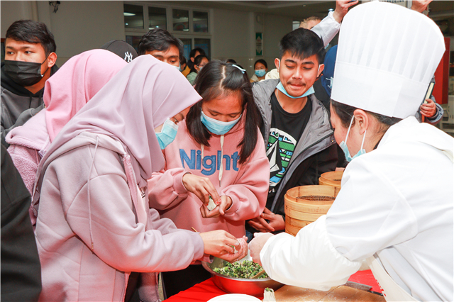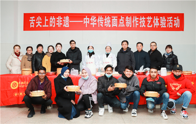 1月6日下午,我校组织在校的近20位国际留学生来到教工餐厅,参加由芜湖耿福兴餐饮管理有限公司和我校共同举办的“舌尖上的非遗—中华传统面点制作技艺体验活动”,现场体验中华传统美食制作技艺。本次活动由生物工程学院和三食堂馨雅餐厅协同承办。市文化馆、市非物质文化遗产保护中心党支部书记丁苏琴、办公室主任杨琪,耿福兴餐饮公司董事长高述红、总经理李炜,校党委宣传部和校工会负责人、生物工程学院党政负责人、食品教研室全体教师以及食品科学与工程专业3+2本科班10余位同学代表共同参加了本次活动。
