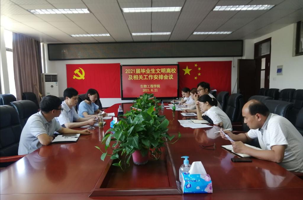 为确保广大毕业生安全、文明、有序离校,6月21日,生物工程学院在学院会议室召开了2021届毕业生文明离校及相关工作安排会议,学院班子成员以及全体毕业班班主任参加会议。