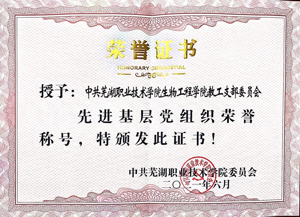 为隆重庆祝中国共产党成立100周年,全面贯彻落实党的十九大和十九届二中、三中、四中、五中全会精神,不断增强“四个意识”、坚定“四个自信”、做到“两个维护”,充分发挥党组织战斗堡垒作用和党员先锋模范作用,引导和激励各基层党组织和广大党员干部以饱满的热情和昂扬的斗志全面提升党建工作质量,聚力“双高建设”,奋力开创“全国一流、世界影响、专本(硕)一体的芜湖职业技术大学”建设新局面,奋力谱写学校高质量发展新篇章。根据《中国共产党党内功勋荣誉表彰条例》及市委有关文件规定,芜湖职业技术学院校党委采取自下而上、上下结合的方式,组织所属党组织和党员开展了优秀共产党员、优秀党务工作者、先进基层党组织的推荐评选工作。经基层党组织推荐,组织部等部门考察审核,并经学校党委研究决定,生物工程教工党支部在2021年校“两优一先”表彰活动中喜获校“先进基层党组织”荣誉称号