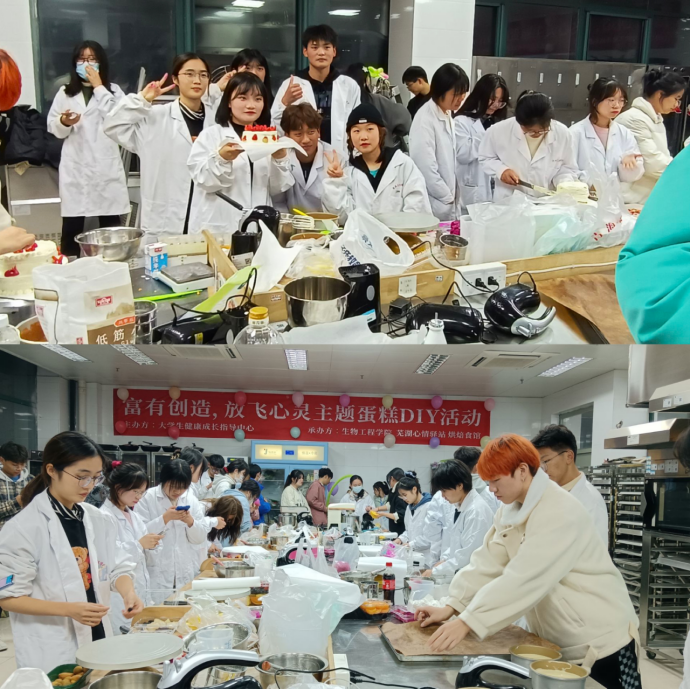 手工蛋糕烘焙,制作温馨甜品。为进一步丰富活动形式,发挥双高专业群建设的特色优势,学院特举办以“富有创造,放飞心灵”为主题的“蛋糕DIY”活动,活动吸引了各二级学院共30余名同学参加。在芜湖心情驿站与烘焙食馆的共同组织下,同学们陆续尝试自己动手制作慕斯蛋糕,完成了一个个精美蛋糕的制作。整场蛋糕制作活动不仅为喜爱烘焙的同学们提供了展现自我优势的舞台,也在同学们之间建立起了互帮互助的友谊,让大家在紧张的学习之余,感受到了亲手制作蛋糕的愉悦。