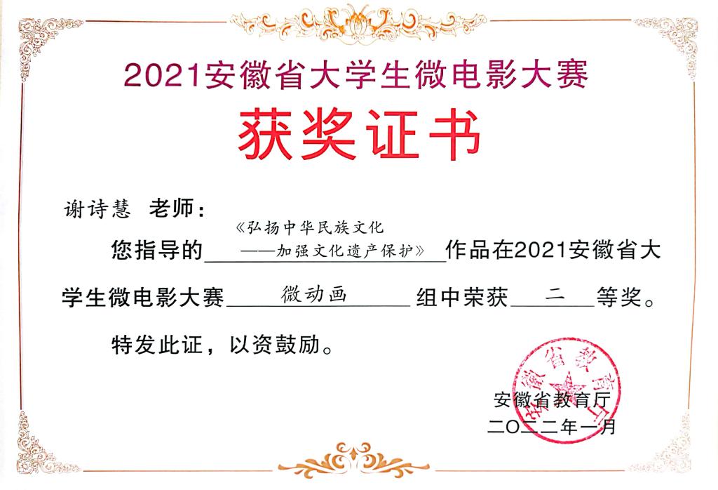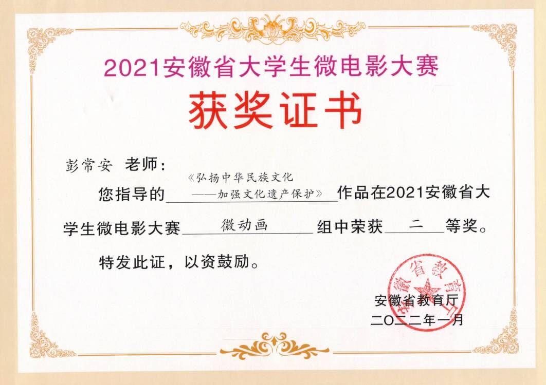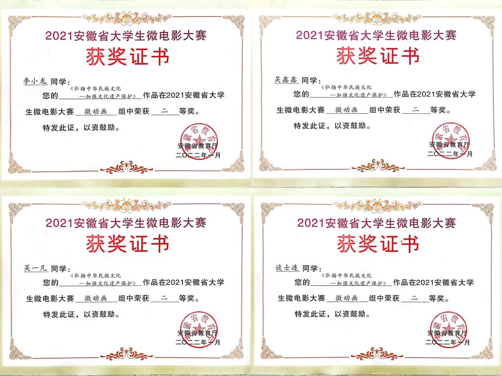 近日,由安徽省教育厅主办,安徽财经大学承办的第四届安徽省大学生微电影大赛获奖证书陆续发放,食品与生物工程学院推送作品《弘扬中华民族文化——加强文化遗产保护》荣获微动画组二等奖。