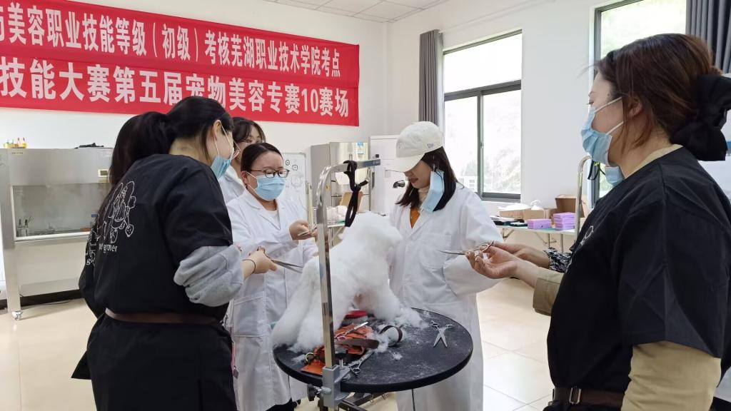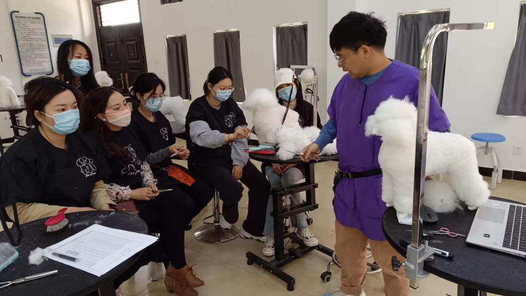 张冬冬代表学院对实践基地领导老师一行表示欢迎,随后,双方围绕宠物美容与护理开始系统学习交流。牧医教研室许泽军老师围绕宠物美容与护理的理论知识,着重介绍了宠物美容工具的使用方法,黎婷老师围绕宠物美容与护理的实践知识,现场演示了贵宾犬运动装的造型修剪。