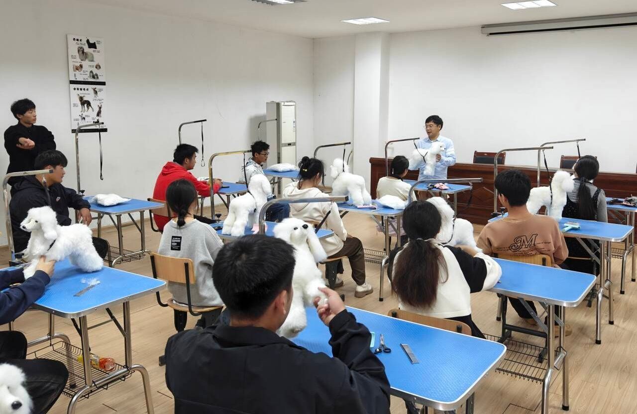 与此同时,牧医类专业同学们跟随老师们来到宠物护理与美容实践基地,许泽军老师围绕宠物美容与护理的理论知识,着重介绍了宠物美容工具的使用方法,并围绕宠物美容与护理的实践知识,现场演示了犬只造型修剪,帮助同学们在实践中夯实所学。