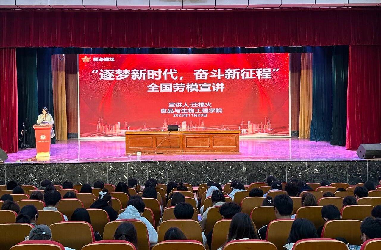 11月29日,食品与生物工程学院特邀全国劳动模范、校产业教授、“全国劳模创新工作室”汪根火先生来我校文津校区大礼堂开展“匠心讲坛”活动。学院领导班子成员、食品和药品类专业全体同学参与聆听。
