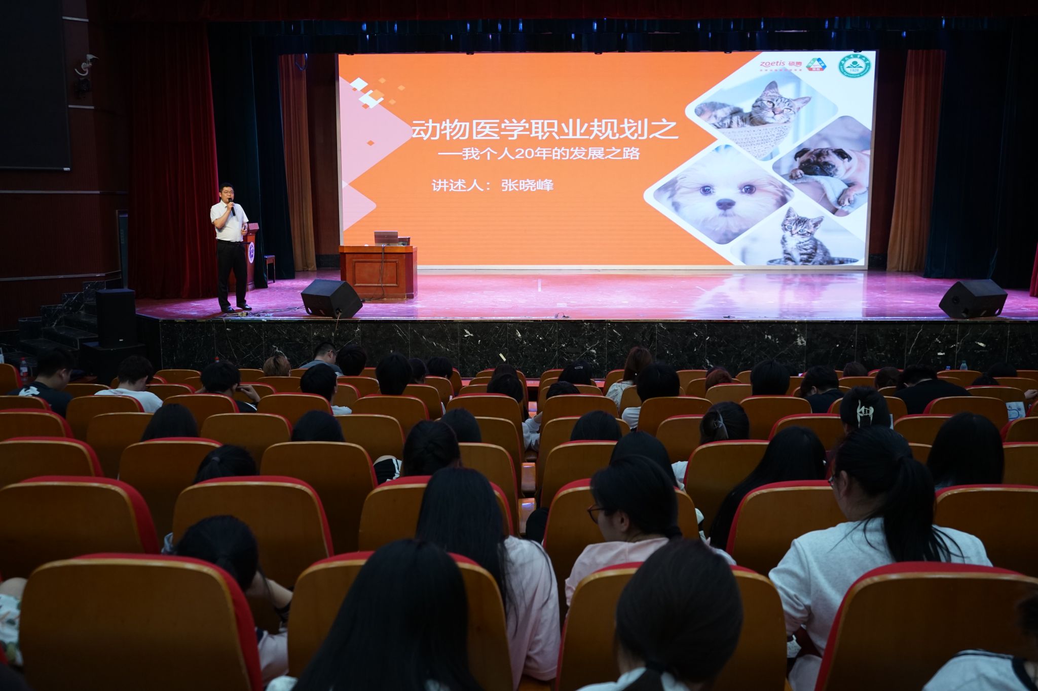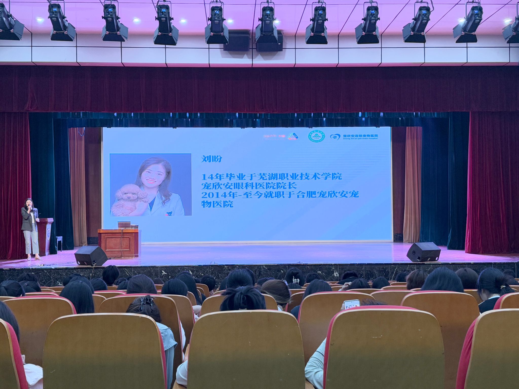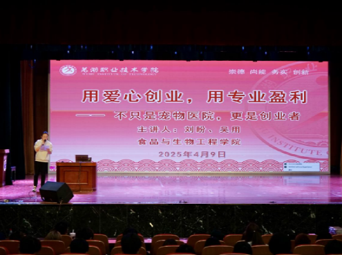 2025 年 4 月 10 日下午,食品与生物工程学院成功举办了主题为“用爱心创业 用专业盈利”的大学生职业生涯规划创业宣讲活动。此次活动特别邀请了四位行业精英,他们分别是硕腾(上海)企业管理有限公司华东三区地区经理许正武、合肥宠欣安连锁宠物医院总院长张晓峰、合肥宠欣安眼科专科医院院长刘盼以及六安宠福鑫连锁宠物医院院长吴用。其中,刘盼和吴用分别是我院 2014 届和 2015 届的优秀校友,他们的回归为此次活动增添了更多亲切感和榜样力量。