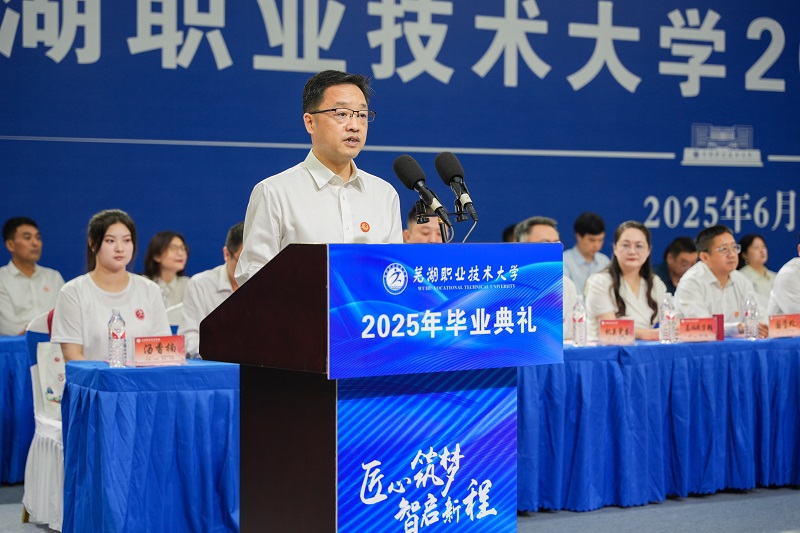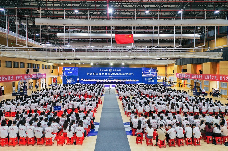 6月28日上午,学校在文津校区体育馆三楼举行2025年毕业典礼。7600余名毕业生怀揣梦想,奔赴广阔天地。在芜全体校领导,各单位负责人,优秀教师代表,杰出校友代表,后勤保安等服务单位代表,各学院辅导员以及2025届毕业生共同见证这一庄严而难忘的时刻。典礼以饱含师生惜别之情与未来憧憬的暖场联唱拉开序幕,现场掌声热烈。典礼由校党委副书记袁家和主持,分“匠心・沉淀”“筑梦・启航”“智启・未来”三个篇章,全面展现了芜职学子的成长历程与未来展望。