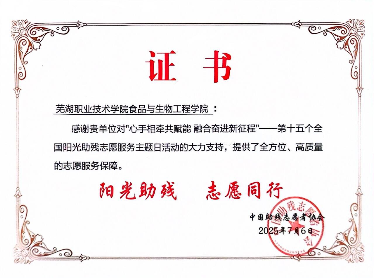 7月6日,中国助残志愿者协会10周年发展历程系列活动暨“心手相牵共赋能 融合奋进新征程”第十五个全国阳光助残志愿服务主题日活动在芜湖市举行,活动由中国助残志愿者协会、芜湖市人民政府主办。活动现场,芜湖职业技术大学食品与生物工程学院被正式授予全国“阳光助残志愿服务基地”称号。食品与生物工程学院党总支书记彭常安、全国青年文明号号长刘宽辉受邀参加活动。
