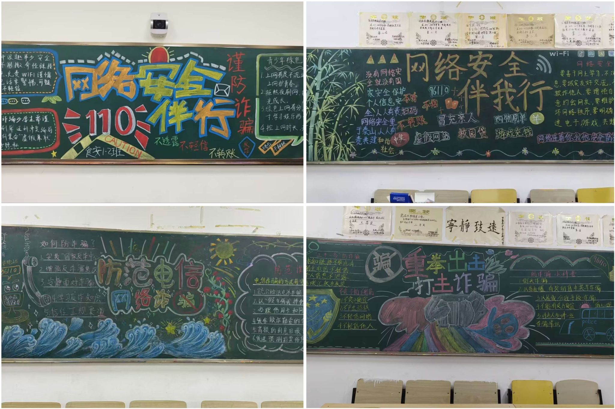 在主题黑板报绘制活动中,各班级同学积极响应,围绕“网络安全伴我行”“防范电信网络诈骗”等核心主题,通过鲜明的色彩、生动的案例和醒目的标语,生动展现了电信网络诈骗的常见类型,如刷单返利诈骗、校园贷诈骗、冒充客服诈骗、冒充亲友诈骗等,同时清晰标注了防骗要点和求助渠道,营造了“人人识诈、人人防诈、人人反诈”的氛围。