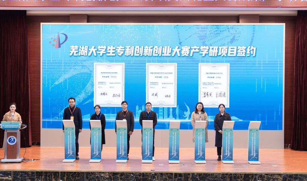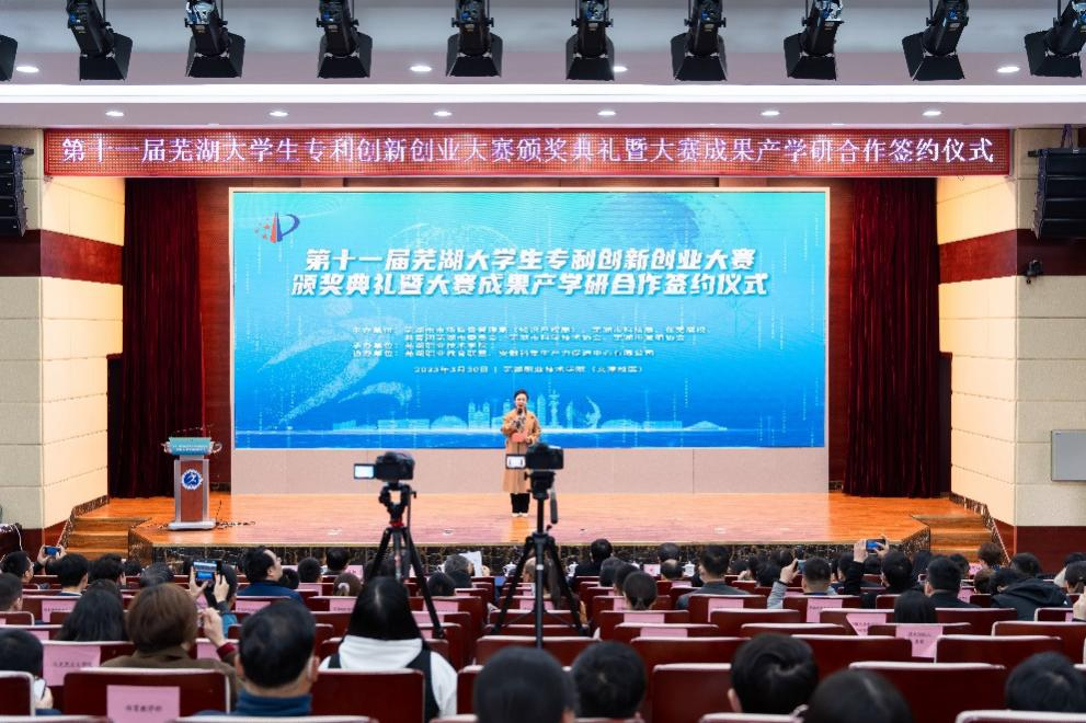 3月30日,由芜湖市市场监督管理局(知识产权局)、市科技局、在芜高校、团市委、市科协、市发明协会共同主办,我校承办的第十一届芜湖大学生专利创新创业大赛颁奖典礼暨大赛成果产学研合作签约仪式在文津校区图书馆报告厅举行。安徽省市场监督管理局党组成员、副局长,省知识产权局局长程胤,安徽省市场监督管理局知识产权运用促进处一级调研员虞东海,芜湖市市场监督管理局(知识产权局)党委书记、局长唐诚,副局长朱寿发,市发明协会、市科技局、市科协、团市委等相关部门领导、各参赛高校主要负责人、获奖选手和指导教师代表,以及企业代表共计130余人参加了本次颁奖典礼。校党委副书记、院长高武,副院长刘育红出席本次颁奖典礼,典礼由经济管理学院教师阮妙茹主持。